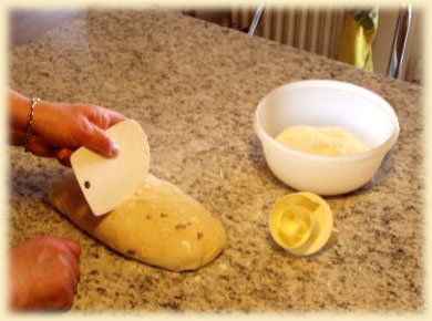 Den Teig aus dem Topf nehmen und auf etwas Mehl in 16 gleiche Stücke teilen (Bild 1-3).