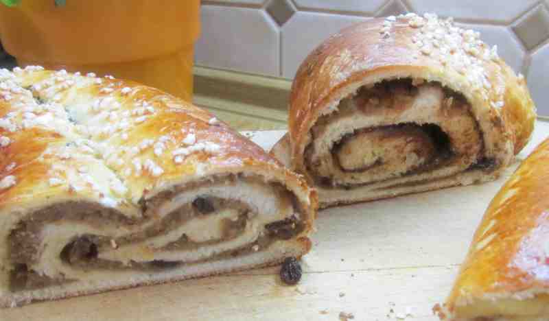 250 g gemahlene Walnüsse mit ca. 20 g Zucker, 1 Prise Zimt, 1 Eiweiß,3-4 EL Milch verrühren. Auf 1 /3 des Teiges aufstreichen, am besten mit einem kleinen Spatel. Wer mag, gibt Sultaninen drüber.