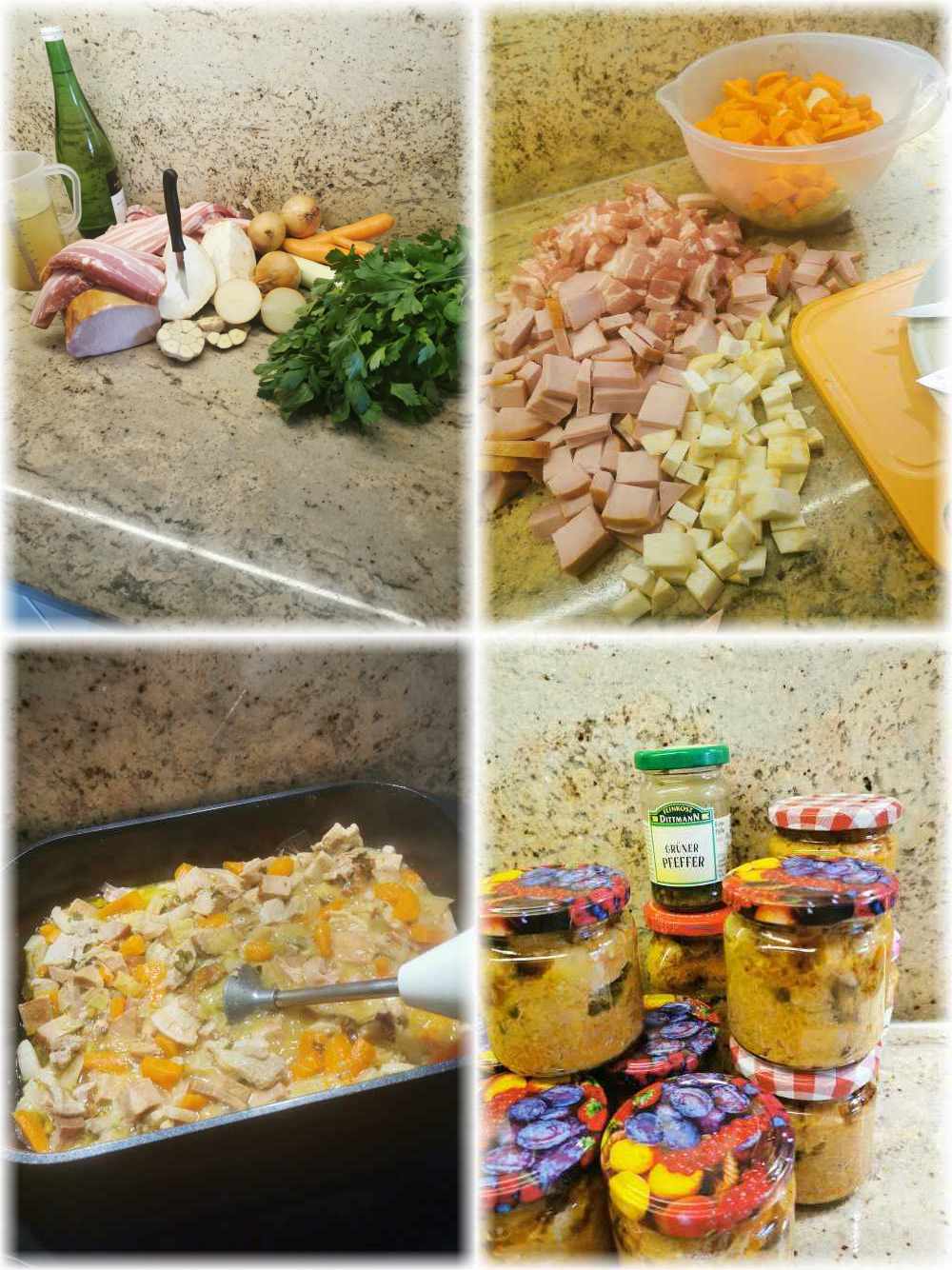 Jetzt wird das Fleisch schön zerkleinert oder mit Gabeln auseinandergezogen. Ich bevorzuge dazu meinen Zauberstab und kann den Feinheitsgrad genau bestimmen. Es dürfen schon noch Stückchen zu sehen sein. Ich fülle nun das Rillette in kleine Gläser und gebe je nach Lust und Laune Pfefferkörner hinzu, grüne oder rote. Die Gläser nicht ganz vollfüllen. Den Inhalt des Glases rühre ich dann kurz mit einem Kaffeelöffel durch. So habe ich nun 3 Sorten Rillette. Das Schweineschmalz erhitze ich und fülle damit das Rillette auf und schraube fix den Deckel drauf. Das Schmalz schließt beim Erkalten den Inhalt vollständig ab und so bleibt das Rillette länger frisch.