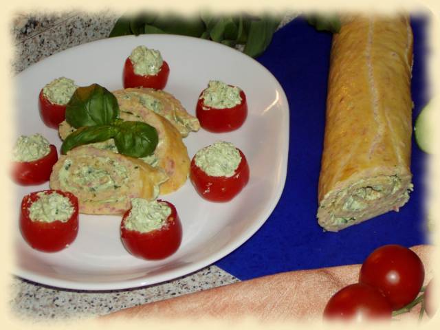| 6 Tomaten | Deckel abschneiden und aushöhlen, die ausgehöhlten Tomaten mit der Käsemischung füllen und den Deckel wieder aufsetzen Die Tomaten auf einem Teller mit einigen Blättern Frisée-Salat oder Lollo-Bianco garniert servieren |