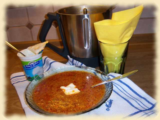 1 l Fleischbrühe 100 g Süsse Sahne 4 EL Tomatenmark 1 TL Salz ½ TL Pfeffer |