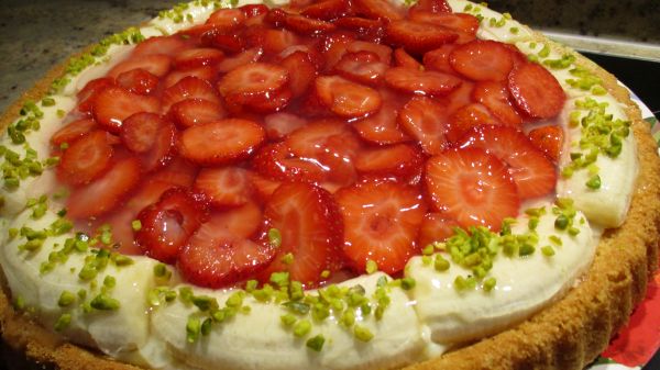 100 g Zucker 1 Vanillezucker 3 Eier 40 g Sonnenblumenöl 20 g Weinessig 150 g Mehl 405 1 Pck. Backpulver 15 Sekunden/Stufe 4 verrühren. Den Teig in eine mit Easy-out Backspray ausgesprühte und mit Semmelbröseln ausgestreute Tortenbodenform einfüllen. Mit einem Spatel etwas verteilen. Beim Backen füllt sich die gesamte Form. Der Teig sieht eher etwas wenig aus. Bei 200 ° Ober-Unterhitze oder 160° Umluft ca. 15-20 Minuten backen. Nimmt man die doppelte Menge an Zutaten, kann man den Teig auch in einer Springform backen und erhält so einen bisquitartigen Kuchen zum Füllen. Das Bild stellt eine saisonbedingte Erdbeertorte dar. Ihrer Phantasie sind keine Grenzen gesetzt. Um ein Durchweichen des Bodens zu verhindern, bestreicht man ihn mit geschmolzener Schokolade oder man kocht aus einem Tütchen Vanillesossenpulver einen "kleinen" Pudding. Dazu benötigt man auch nur die Hälfte der Milch. In heissem Zustand direkt auf den Boden geben und verteilen. Nach dem Erkalten dann mit Obst belegen und mit Tortenguss überziehen. Gutes Gelingen und guten Appetit! |